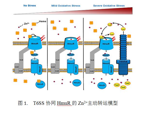 他们研究发现,泰国伯克霍尔德氏菌中的T6SS可通过分泌一个Zn2+结合蛋白TseZ转运锌并对抗氧胁迫, 通过GST pulldown从该菌细胞裂解液中筛选到一个与TseZ有特异相互作用的TonB依赖型外膜血红素转运蛋白HmuR。进一步研究发现,HmuR是一个与氧化还原调控相关的双功能转运蛋白,其在正常生理条件下行使血红素铁转运功能,而在氧胁迫环境下行使Zn2+转运功能,HmuR的底物切换通过响应胞外氧化应激信号导致分子内两个信号感受Cys残基形成分子内二硫键而实现。HmuR作为细菌抗氧化胁迫的第一道防线,不仅保证了细菌对胞外环境变化的快速响应,并且提供了一种精细调控机制使细菌对胞外不同程度的氧化应激信号做出对应等级的反应。