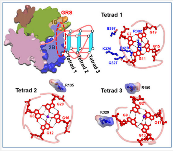 G-四链体(G4s)是一类异常稳定的DNA二级结构,会引起基因组不稳定。细胞为了克服G4形成的潜在障碍,已进化出不同的蛋白质家族来展开G4。其中,Pif1是一种来自超家族1 (SF1)的DNA解旋酶,从细菌到人类高度保守,能够有效展开G4。在这里,我们展示了第一个与G4 DNA复合的Thermus oshimai Pif1 (ToPif1) 晶体结构。我们的结构表明,1B/2B结构域上具有一个G4识别平面(GRS),ToPif1通过位于GRS上的一组氨基酸识别整个天然G4。G4在与ToPif1结合时保持其三层螺旋桨式的拓扑构型,没有显著的结构重组。G4中的三个G-四分体主要通过GRS残基和核糖-磷酸骨架之间形成的静电、离子相互作用和氢键被GRS残基识别。对比之前解析出的与G4-SF2 解旋酶复合体,我们的结构揭示了来自不同超家族的解旋酶如何采用不同的策略来识别和展开G4。