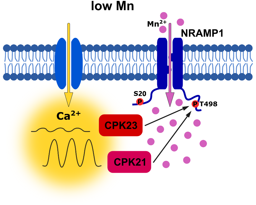 锰是植物生长发育的必需微量元素之一。在pH值较高的碱性土壤和钙质土壤,植物可吸收利用的锰减少,导致植物缺锰。目前关于锰转运的研究多集中于转运体的发掘及功能验证,对上游的调控机制却知之甚少。该研究最新发现,低锰胁迫可以触发一种长时间的Ca2+信号振荡,而在根的伸长区(EZ),这种Ca2+信号振荡的响应最为强烈。通过蛋白互作筛选的手段,该研究发现很可能是钙依赖性蛋白激酶CPK21和CPK23与定位在质膜上的锰转运体NRAMP1互作来响应这种长时间的Ca2+信号振荡。同时,通过CRISPR/Cas9技术构建的cpk21/23双突变体在低锰胁迫下表现出敏感表型,而CPK23的过量表达则增强了植物对低锰胁迫的耐受性。通过磷酸化实验,发现CPK21/23可以磷酸化修饰锰转运体NRAMP1蛋白的Ser20和Thr498位点。最后,通过生物化学分析、低锰敏感酵母转运分析和转基因株系的表型分析证明了Thr498对于NRAMP1的锰转运活性至关重要。该研究发现了Ca2+-CPK21/23-NRAMP1调控途径是植物响应低锰胁迫的重要机制(图1)。该研究加深了对Ca2+信号调控植物锰稳态的理解,并为今后碱性土壤上的低锰逆境应答研究和农作物遗传改良奠定了坚实的基础。