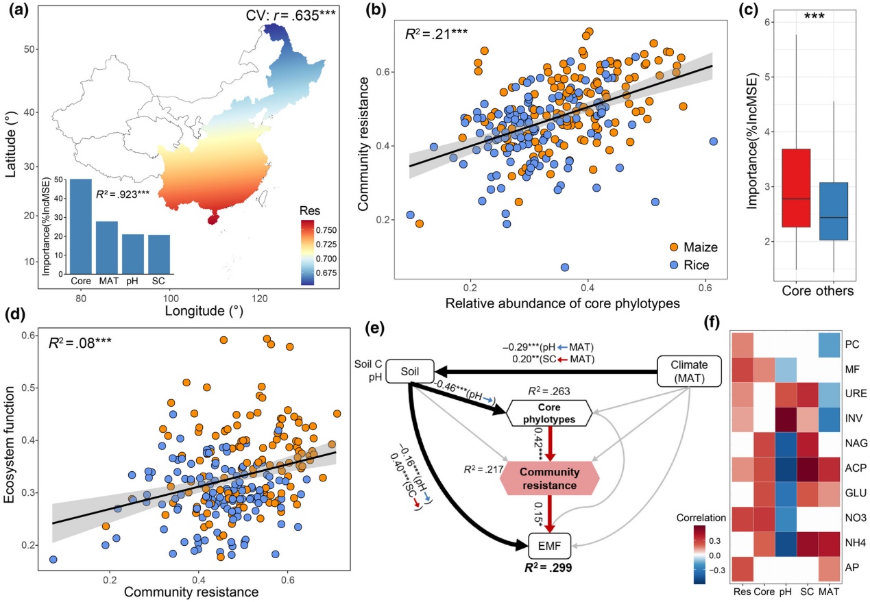 农业生态系统面临着日益严重的环境变化。在不断变化的环境中,揭示地下生物的生态稳定性是维持农业生态系统服务管理战略的关键。本研究以中国东部和东南部相邻种植10年以上的玉米和稻田为研究对象,在大空间尺度上研究土壤核心微生物群对土壤微生物群(细菌、真菌和原生生物)对气候变化和养分添加的抗性的预测作用,以及它们对多种生态系统功能的影响,揭示了土壤微生物群对作物生长和健康的重要作用。从群落、系统发育和网络复杂性等抗性指数的多个方面来看,玉米土壤中微生物的抗性比水稻土壤中微生物的抗性更强。土壤微生物的抗性呈现出低纬度地区的抗性较高的地理格局,表明温暖地区的抗性较强。该研究特别强调了核心菌群在增强土壤微生物群落群体抗性方面的作用,这对于维持农业生态系统中的多功能性至关重要。此外,该研究结果显示,将核心菌群与群落抗性和生态系统功能联系起来,可以预测农业生态系统动态,以应对持续的环境变化。这些结果表明,在全球变化情况下,核心菌群应被视为提高农业可持续性和作物生产力一个关键因素。