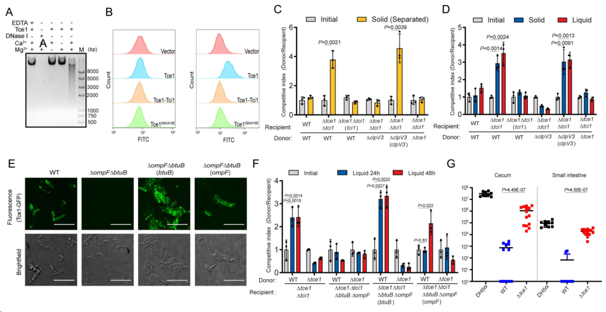 论文摘要:Bacterial type VI secretion systems (T6SSs) inject toxic effectors into adjacent eukaryotic and prokaryotic cells. It is generally thought that this process requiresphysical contact between the two cells. Here, we provide evidence of contact-independent killing by a T6SS-secreted effector. We show that the pathogen Yersinia pseudotuberculosis uses a T6SS (T6SS-3) to secrete a nuclease effector that kills other bacteria in vitro and facilitates gut colonization in mice. The effector (Tce1) is a small protein that acts as a Ca2+- and Mg2+-dependent DNase, and its toxicity is inhibited by a cognate immunity protein, Tci1. As expected, T6SS-3 mediates canonical, contact-dependent killing by directly injecting Tce1 into adjacent cells. In addition, T6SS-3 also mediates killing of neighbouring cells in the absence of cell-to-cell contact, by secreting Tce1 into the extracellular milieu. Efficient contact-independent entry of Tce1 into target cells requires proteins OmpF and BtuB in the outer membrane of target cells.The discovery of a contact-independent, long-range T6SS toxin delivery provides a new perspective for understanding the physiological roles of T6SS in competition. However, the mechanisms mediating contact-independent uptake of Tce1 by target cells remain unclear.