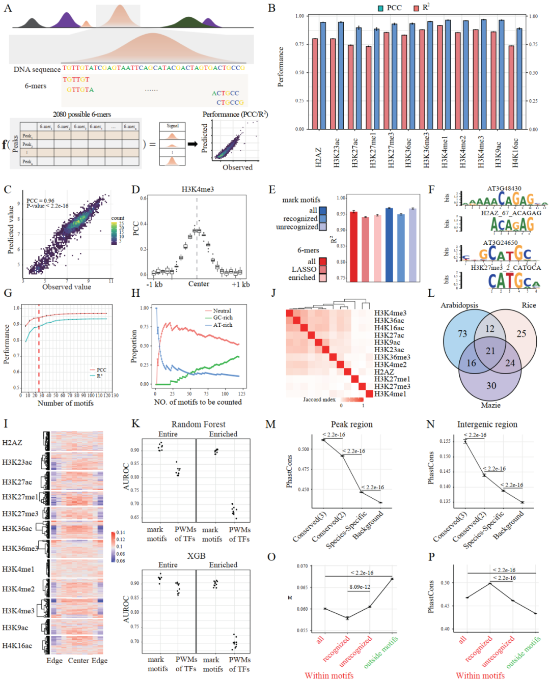 A:所用模型示意图;B-E:不同序列特征的模型预测效果;F-J:mark motif的序列特征及其预测能力;K:不同序列特征在区分叶和根特异性H3K4me3修饰位点的表现;L:物种间mark motif的同源性;M-P:mark motif受到较强的功能约束。