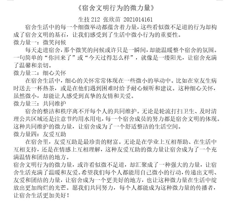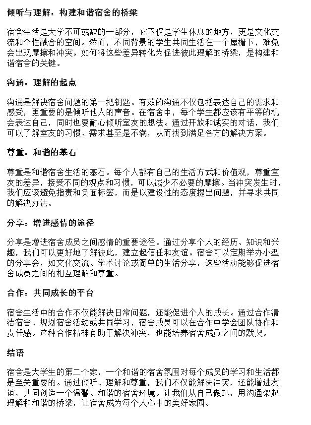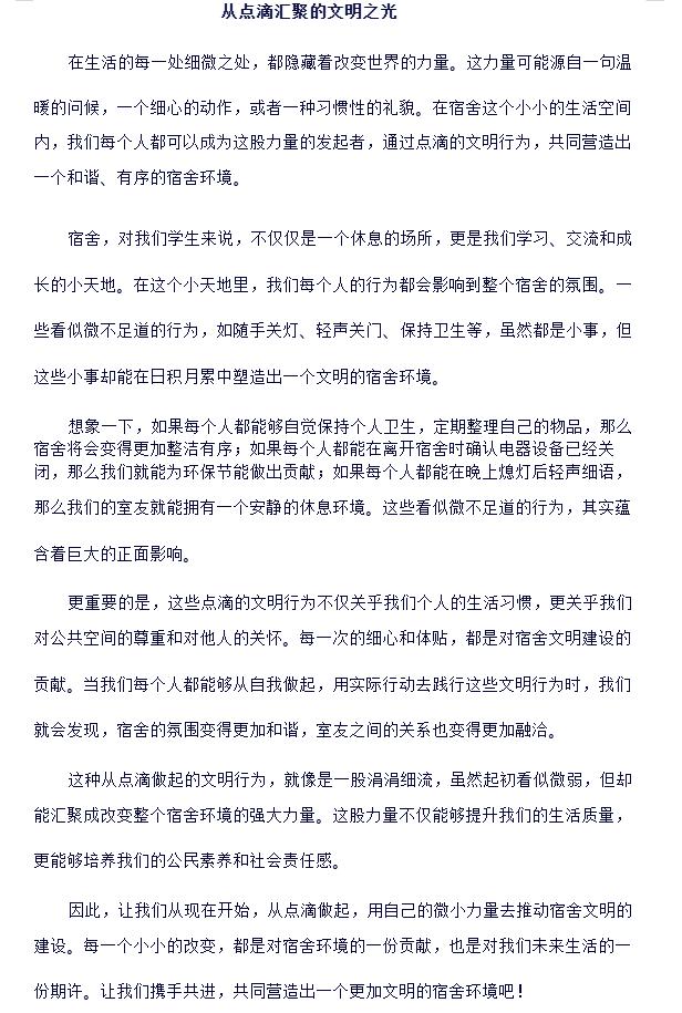 此次征文活动不仅为同学们提供了一个展示自我、交流思想的平台,也进一步深化了同学们对宿舍文明建设的认识,激发了他们的参与热情。相信在全校师生的共同努力下,公司宿舍文明建设一定会迈上新的台阶,为打造更加和谐、温馨的校园环境贡献一份力量。