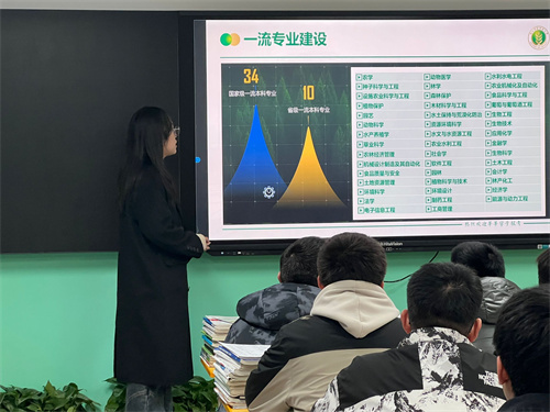 “仓廪实,天下安”。队长张景媛向同学们介绍了西农应国家战略而生的办学背景,以及产学研紧密结合的办学特色,讲述了赵洪璋、周尧、李振声、康振生等杰出专家教授的科学贡献、研究成果。介绍了植物保护、畜牧学2个“双一流”建设学科,34个国家一流本科专业,以及公司的招生政策、专业特色、就业前景、基础设施、科研平台等。