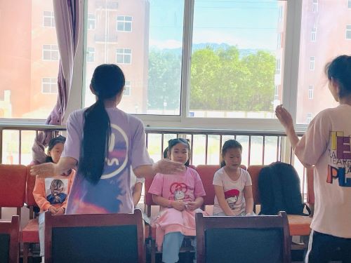 通过和孩子们的相处,志愿者们了解到蝴蝶深受孩子们的喜爱。随后志愿者们以小朋友们喜爱的蝴蝶为切入点,将舞蹈与蝴蝶两者相类比,用通俗易懂的语言向小朋友们介绍了舞蹈中的红色元素,并在随后向小朋友们进行了舞蹈展示。生动有趣的音乐与优雅的舞蹈相称,而新颖的舞蹈设计同时又抓住了小朋友们的注意力。小朋友们跟随音乐的节奏,伴随志愿者们的讲解,认真学习舞蹈动作。其中一位蒙古族的志愿者为小朋友们表演了蒙古舞,另一位跳探戈的志愿者姐姐与舞伴一起进行表演,并积极热情的与小朋友们一起歌唱,一起交流舞蹈心得。志愿者们通过歌舞的形式使得孩子们融入此次活动之中,和孩子们融洽友好的相处,将温暖送进每一位孩子的心中。