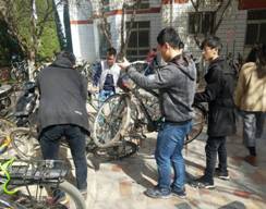 下午三点前所有参加该活动的志愿者、阳光团员和部委都已集合完毕整装待发。活动于下午三点准时开始,由阳光团工委副部张珊带领大四同学们前往理科楼区域整理废弃自行车。其余的同学由预先订好的分组,各组自行前往各组分配的区域。到达预订区域后,同学们根据保卫处给出的"废弃自行车判定方法"来判断自行车是否是废旧的。那些明显比较新的仍被使用自行车就被志愿者们按照一定的次序整理整齐,等待着继续使用。途中有部分自行车难以判断是否仍在被使用,经过大家的讨论,最终在统一大家的看法后决定是否整理出来。最后每个区域选择出的废弃自行车都会被整理到指定地点,便于保卫处进行下一步处理。而那些剩余的自行车就被同学们整理的十分整齐。保卫处的叔叔们表示了对志愿者们的感谢。“这些孩子们省去了我们不少麻烦,前两天我们还头疼这个事情怎么办呢!”志愿者们都露出了腼腆的笑容。