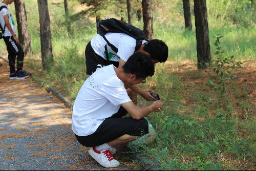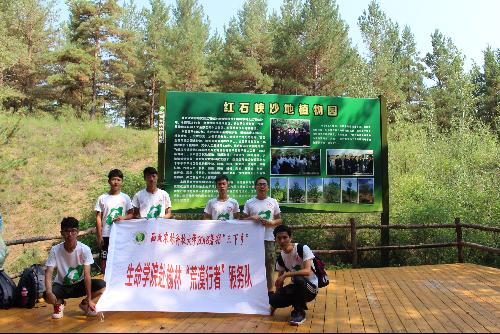 7月20日上午,“荒漠行者”服务队全体成员来到榆林沙地植物保护基地。远远望去,队员们看到的不是一望无际的黄沙而是郁郁葱葱的绿植。樟子松、彰武松、圆柏等各类植物营造出一片静谧,让队员们仿佛置身于东北的长白山松林而非陕西榆林的半干旱沙地。俯身看去,更是有许许多多的“沙地精灵”:被誉为“沙漠中一朵奇葩”的角蒿开出了鲜艳的粉红色花朵,为这片沙地增色不少;挂满了一个个四角形果实的卫矛更是给人以丰收的喜悦;沙地环境所特有的沙柳犹如一个个沙地卫士,自恃责任重大,保卫着这片土地不再被风侵蚀。队员们拍摄采集了这些沙地典型植物,接着又来到基地办公室对办公室主任进行了采访。此间,队员们了解到这片两至三千亩的林地基本靠飞播造林技术形成,始于五六十年代,成形于七八十年代,是榆林地区成功治沙的先锋榜样,2002年还迎来了时任国家主席江泽民同志的参观考察。时至今日,它依旧是陕西省乃至全国治沙的典范,得到了习近平总书记的指示。