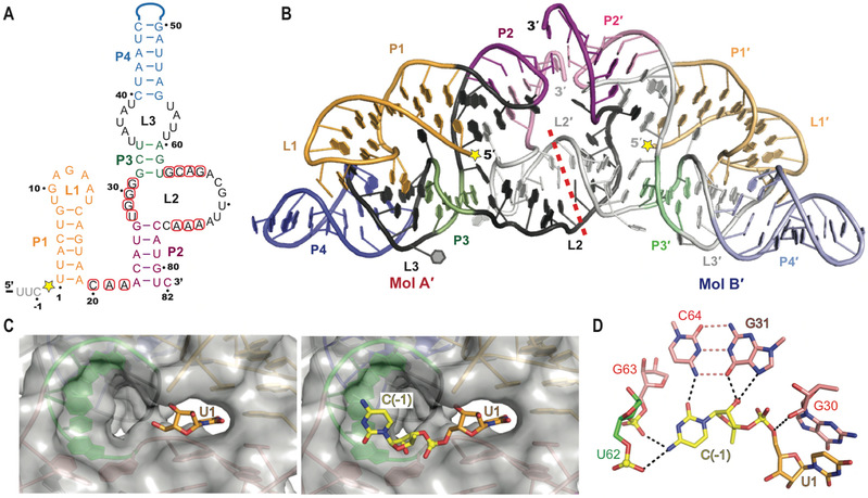 核酶是一类具有催化功能的非编码RNA分子,在病毒基因组复制、mRNA前体加工以及选择性剪切等生物学过程中发挥着重要作用。小的自剪切型核酶(small self-cleaving ribozyme)发现于30多年前,长度在50到150 个碱基之间,至今只有九类自剪切型核酶被报道。Hatchet核酶是2015年被发现的几类新型核酶之一。与其他几类同期发现的新型核酶相比,Hatchet核酶是唯一一类酶切位点处于核酶5'末端的核酶。二级结构显示,Hatchet核酶含有四个茎区(Stem) P1、P2、P3、P4 以及三个主要的环区(Loop)L1、L2和L3, 其中L1处于P1的末端,L2与 L3分别处于P3的两端,并分别连接P2和P4(图A)。