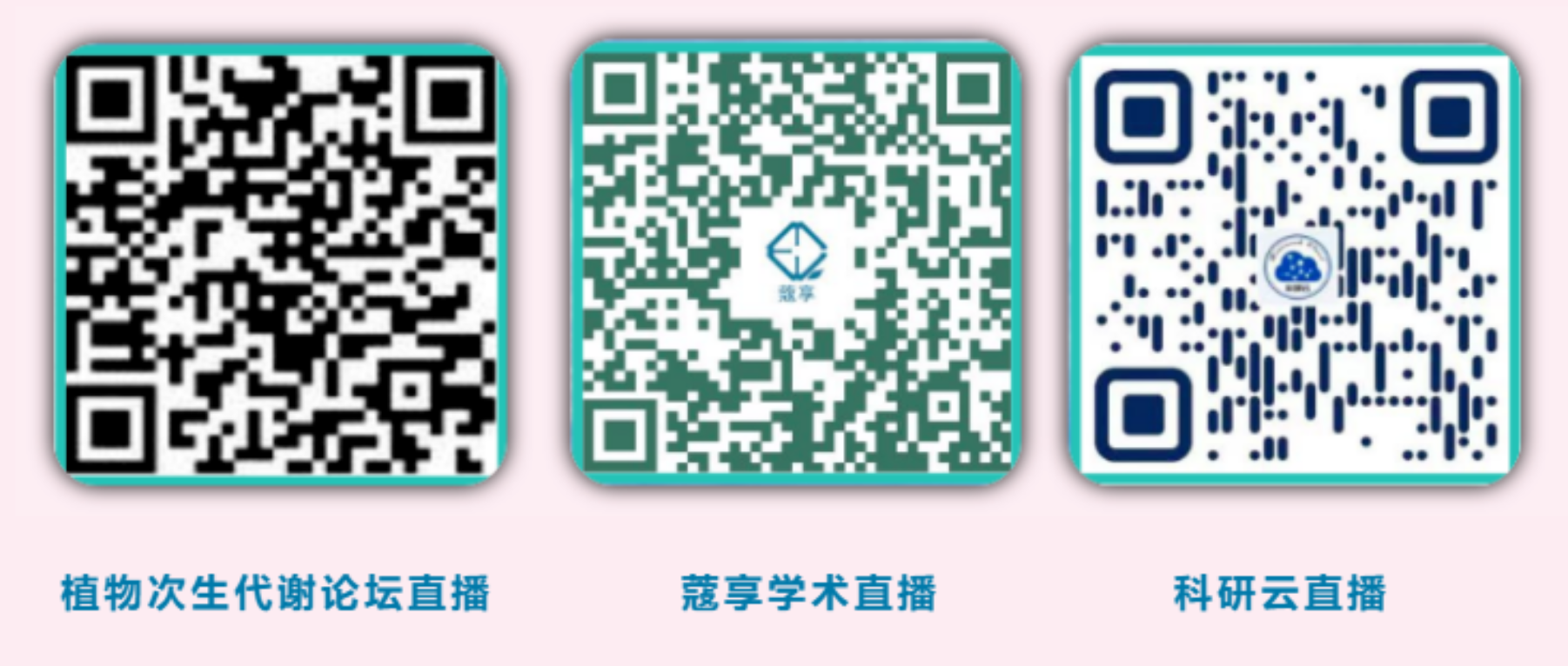本次线上会议有3个平台同时进行直播,分别为植物次生代谢论坛直播(哔哩哔哩bilibili)、蔻享学术直播及科研云直播平台,请扫码或点击网址链接在线观看直播,请记得观看前完成注册登记。