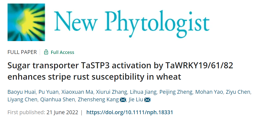 近日,best365中国官网康振生院士团队/刘杰教授课题组在New Phytologist在线发表了题为“Sugar transporter TaSTP3 activation by TaWRKY19/61/82 enhances stripe rust susceptibility in wheat ” 的研究论文。该研究发现糖转运蛋白TaSTP3在小麦感条锈病过程中被转录因子TaWRKY19/61/82协同转录激活,从而提高寄主细胞的蔗糖浓度以保证病菌的碳源供应。