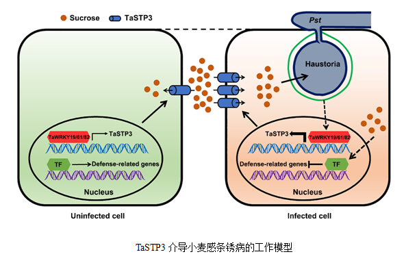 由小麦条锈菌(Puccinia striiformis f. sp. tritici, Pst)引起的条锈病是小麦生产最严重的病害之一。小麦条锈菌是一种专性活体营养寄生真菌,依赖菌丝特化侵染结构—吸器,从寄主吸取营养供其生长发育所需。研究发现,寄主糖转运蛋白为病原菌竞争碳源的重要调控靶标。本文针对受条锈菌诱导的糖转运蛋白TaSTP3在小麦感条锈病过程中的功能及转录调控机制展开研究,深入解析了条锈菌调控寄主糖分易位促进病菌侵染致病的分子机理,研究结果为揭示小麦和条锈菌互作机理,制定可持续性病害防控策略奠定理论基础。