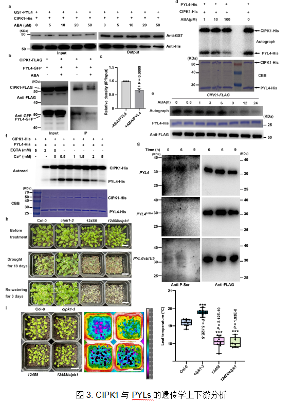 进一步研究发现,ABA可以直接抑制CIPK1与PYLs之间的蛋白互作,并且磷酸化实验表明,ABA可以显著降低CIPK1对PYLs的磷酸化修饰水平。此外,作者还发现CIPK1介导的PYL4的磷酸化需要CBL1/9和Ca2+的参与。最后遗传学上下游分析表明,CIPK1位于ABA受体的上游,通过磷酸化修饰ABA受体负调控ABA信号与干旱胁迫响应 (图3)。