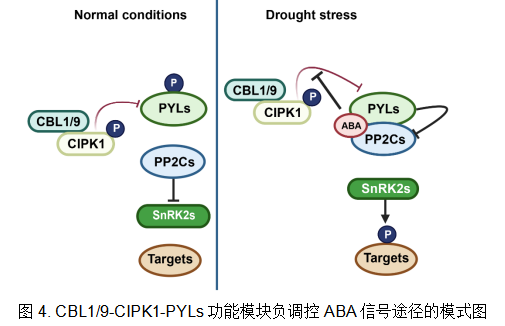 综上所述,该研究揭示了CBL1/9-CIPK1-PYLs功能模块负反馈调节干旱胁迫的分子机理。在正常条件下,CBL1/9-CIPK1磷酸化修饰PYLs以避免异常ABA信号的传递,以此保证植物的正常生长发育。在干旱胁迫条件下,植物体内ABA浓度升高,进一步抑制CIPK1介导的PYLs的磷酸化,从而激活ABA信号通路,增强植物的抗逆性(图4)。该研究通过对Ca2+信号与ABA信号交叉互作机制的解析和ABA受体关键磷酸化修饰位点的挖掘,为后期通过基因编辑等手段提升植物的抗旱能力,以及实现农业中的节水灌溉和培育抗旱作物新品种提供了理论依据和新的思路。