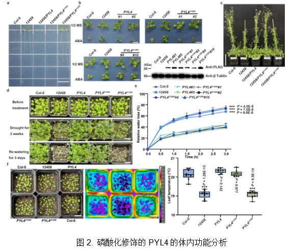 在该研究中,作者发现cipk1(Col-0背景)突变体对干旱胁迫显著耐受,与Col-0相比,离体叶片水分流失较慢,ABA处理下气孔开度明显降低,叶片温度较高,水分蒸腾速率显著下降。而CIPK1的持续激活材料对干旱胁迫明显敏感。进一步通过体内/体外蛋白互作实验发现,CIPK1与14个PYLs中的7个存在蛋白互作(PYR1/PYL1-6)(图1)。并且磷酸化修饰PYL4的第129位丝氨酸,进而导致PYLs成为无活性的ABA受体 (图2)。