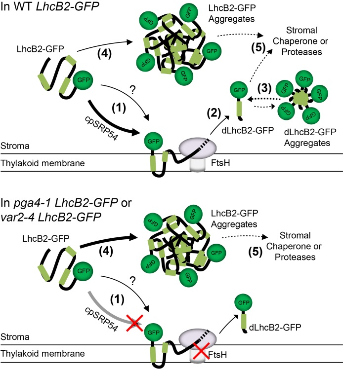 cpSRP54与类囊体FtsH协同参与未折叠LhcB2-GFP的氨基端降解