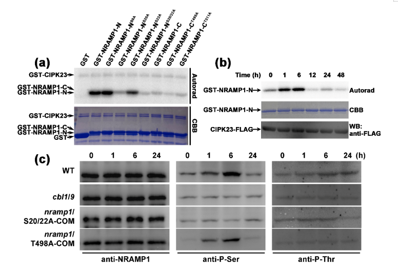 在本研究中,该课题组鉴定了钙感受器CBL1/9及其互作激酶CIPK23形成的复合体正调控拟南芥对锰毒害的耐受能力。研究发现cbl1/9双突变体与cipk23突变体均表现出高锰敏感表型。CBL1以及CIPK23过表达转基因植株的高锰胁迫耐受能力显著提高。此外,通过多种体内/外蛋白互作实验发现CIPK23与锰转运蛋白NRAMP1相互作用,且CIPK23磷酸化修饰NRAMP1的第20/22位丝氨酸,通过体内磷酸化实验进一步发现该磷酸化修饰过程受高锰胁迫诱导,磷酸化水平在高锰处理6h达到最高 (图1)。