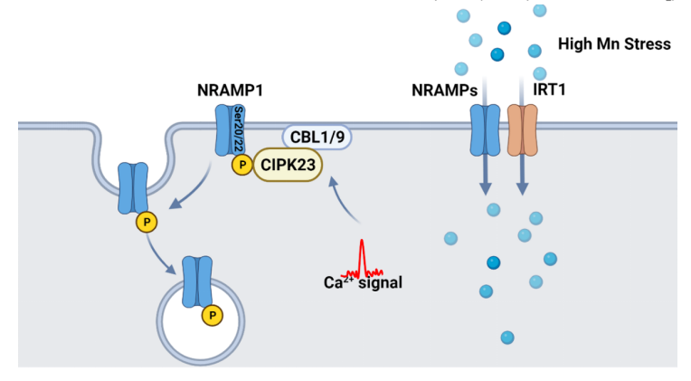 综上,CBL1/9-CIPK23-NRAMP1信号通路调控拟南芥对高锰毒害的耐受能力。高锰诱导Ca2+信号激活CBL1/9-CIPK23复合体,进而磷酸化NRAMP1的第20/22位丝氨酸,从而诱导网格蛋白介导的NRAMP1的内吞作用,以减少其在质膜上的分布,降低植物对锰的吸收,进而增强植物对锰毒害的耐受能力(图3)。本研究丰富了钙信号调控植物对锰毒害的耐受机制,并为解决酸性土壤锰毒害造成的农业安全生产问题提供了理论基础。西北农林科技老员工命科学公司张振乾副教授为该论文的第一作者,王存教授为通讯作者,该研究得到了国家自然科学基金委等项目的资助。