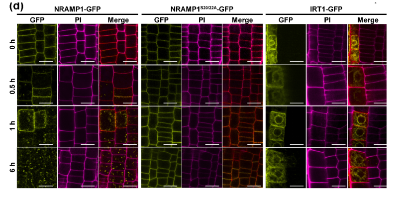 此外,NRAMP1融合GFP的亚细胞定位分析实验表明,NRAMP1的内吞作用随高锰处理时间增加逐渐增强。与体内磷酸化结果相对应,内吞作用也在高锰处理6h达到最高水平,而CBL1/9以及CIPK23的缺失突变与NRAMP1的模拟非磷酸化形式突变(NRAMP1S20/22A) 相同,均严重影响了NRAMP1高锰诱导的内吞作用(图2)。