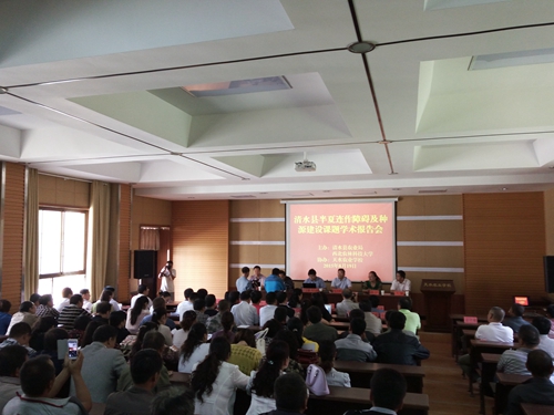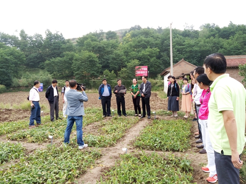 观摩会在清水县永清镇和秦亭镇半夏种植基地举行,清水县政府、农业局、农技站、土肥站、植保站和科技局等领导和科技干部150人参加了观摩。对照田半夏已经枯萎,而试验田和种质圃的半夏苗依然生长旺盛,对比效果显著,得到了与会专家和领导的高度肯定。项目负责人对项目研究进展进行了中期汇报。目前,从种质的引进筛选、异地繁殖、配套栽培技术及病虫防治措施等方面均取得了研究突破,初步筛选出了适宜清水区域种植的品种,缩短连作间隔年限到3-4年,实现了异地繁种,建立了半夏金针虫、软腐病等发病规律和防治措施技术体系,对根腐病的感病基因调控研究进展顺利。