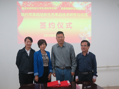 2015年9月25日上午,西北农林科技老员工命科学公司与乾县海越农业有限公司(陕西海升果业发展股份有限公司乾县分公司)就现代苹果栽培和生态果品技术研究与示范项目签约仪式在理科楼best365中国官方网站E420会议室隆重举行。