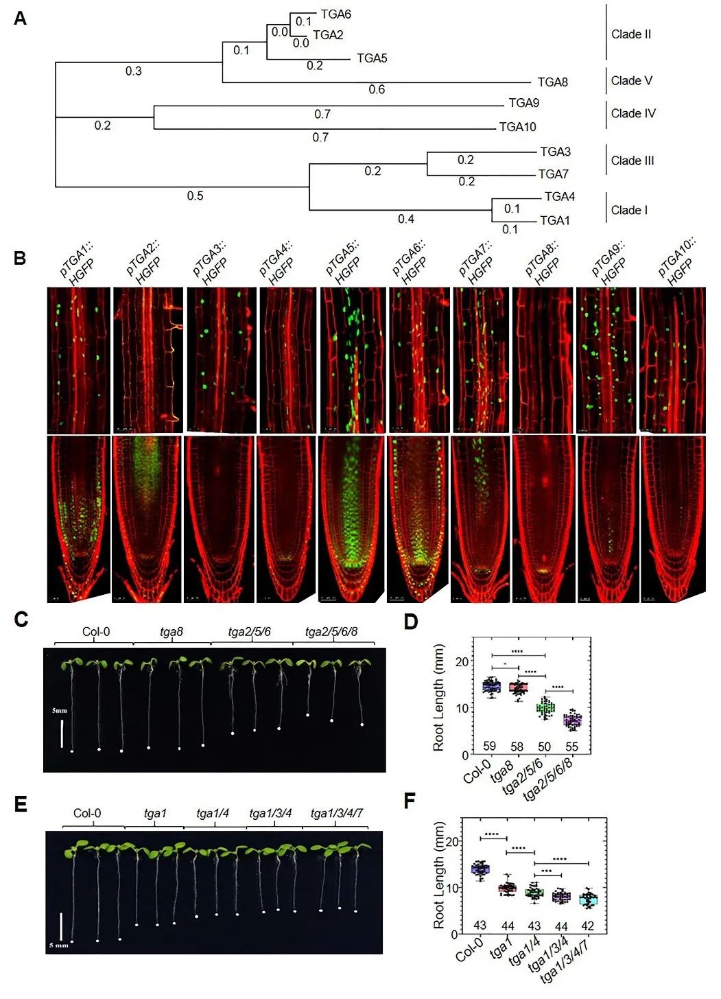 多基因之间的功能冗余一直是阐明基因功能的巨大难题,而通过不同细胞类型的转录组分析是解决该问题的有力工具。该研究首先利用拟南芥根的细胞型特异性RNA-seq数据进行生物信息学分析,发现许多在QC特异性高表达的基因,其中包括TGA8。TGA8突变造成根微弱的生长表型,说明可能与其它TGAs存在功能冗余。通过构建TGAs启动子驱动核定位GFP标记蛋白表达的转基因株系,发现所有的TGAs都在根中表达。突变体分析表明,进化支II(TGA2/5/6)和V(TGA8)在干细胞稳态中确实存在功能冗余,也在伸长区发挥作用,促进细胞伸长。结合转录组分析、组织化学分析和生理测试,作者证明TGA2/5/6和TGA8在细胞氧化还原稳态中具有共同的作用。该研究还发现进化支I(TGA1/4)和III(TGA3/7)的成员在根的生长和发育中也存在功能冗余,尽管它们的作用似乎与TGA2/5/6/8不同。首先,TGA1/3/4/7基因的不同阶突变体QC没有受损,而TGA2/5/6/8基因的不同阶突变体QC形态紊乱。第二,与野生型相比,TGA1/3/4/7基因的不同阶突变体对H2O2敏感性没有差异,而TGA2/5/6/8基因的不同阶突变体表现更为敏感。第三,TGA1/3/4/7基因的不同阶突变体中H2O2和超氧化物含量显著降低,但在TGA2/5/6/8基因的不同阶突变体中H2O2含量没有明显变化,超氧化物含量只是轻微下降。进一步的实验证明,TGA1/3/4/7可能通过过氧化物酶调节氧化还原稳态,而TGA2/5/6/8可能通过影响GSTs类基因的表达调节氧化还原稳态。该研究揭示了TGA1/3/4/7与TGA2/5/6/8通过不同的途径调节或响应氧化还原稳态促进根的生长和发育。TGA转录因子在植物抗病方面具有重要功能(Droge-Laseret al, 2018),它们在氧化还原稳态方面的作用为其抗病功能提供了一种机制上的解释。
