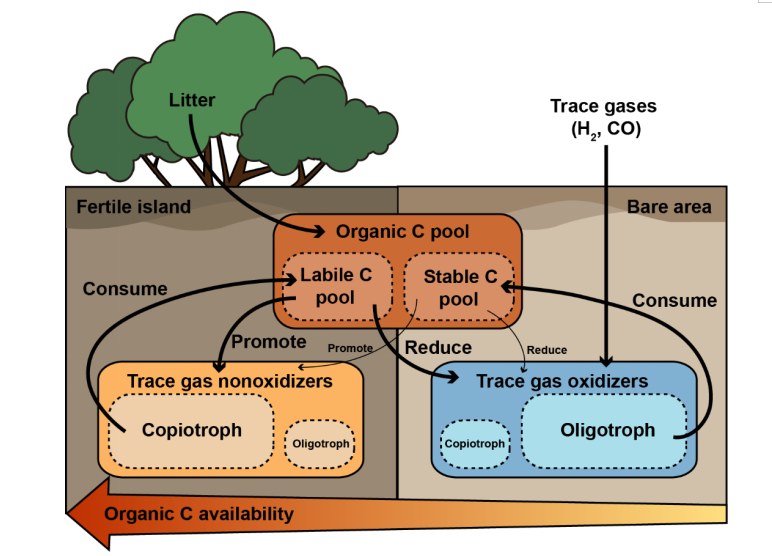 在沙漠生态系统中,“肥岛”效应引起的土壤养分局部富集现象,可使土壤微生物形成相应的异质性分布模式。然而,土壤养分差异驱动微生物群落分化的机制尚未得到深入研究。近期,best365中国官网best365中国官方网站韦革宏教授团队在国际权威期刊The ISME Journal上在线发表题为“Reduced trace gas oxidizers as a response to organic carbon availability linked to oligotrophs in desert fertile islands”的研究论文。文章揭示了土壤微生物通过选择有机化合物或无机微量气体(H2和CO)作为能源物质,从而适应“肥岛”内、外有机碳水平差异的机制,同时,分析了不同能量策略微生物类群的生活史特征。
