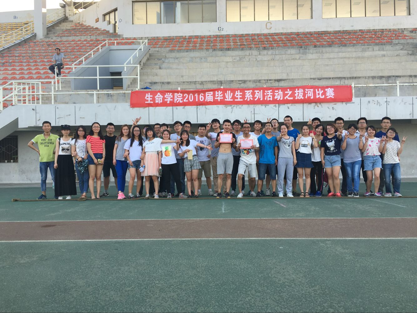 2016届8个毕业班级参赛,由8名男生、6名女生组成班级代表队。比赛采取淘汰制。当比赛的哨声响起,只见参赛的同学们紧握长绳,卯足了劲拼命往后拉,各班同学在队伍旁边加油助威,比赛热情愈加高涨!比赛过程中,各班参赛队员始终咬紧牙关,坚持不懈,场上场下,哨子声、呐喊声此起彼伏。拉拉队成员也个个热情高涨,呐喊助威,给比赛更添一份热烈,一股力量!激烈的比赛将整个活动推到了高潮!经过一下午的角逐,比赛过程激烈刺激,各队选手齐心协力,坚持不懈,最终生技123班摘取桂冠!