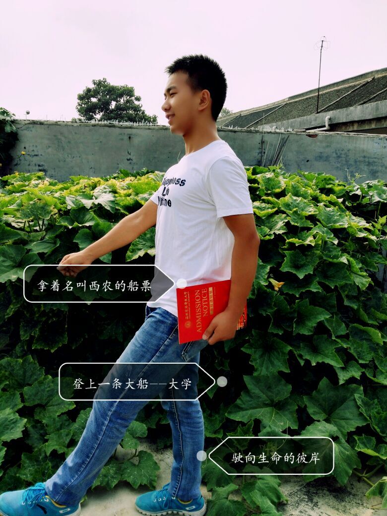 1602班童亮写到:从高中到大学,一个看似短暂的三年,其实我走了很远。经过了高考的洗礼,我选择了西农——一所画中的大学,没有大都市的喧哗,只有小镇的宁静,偌大的校园,美如画的景色,西农,我来了!