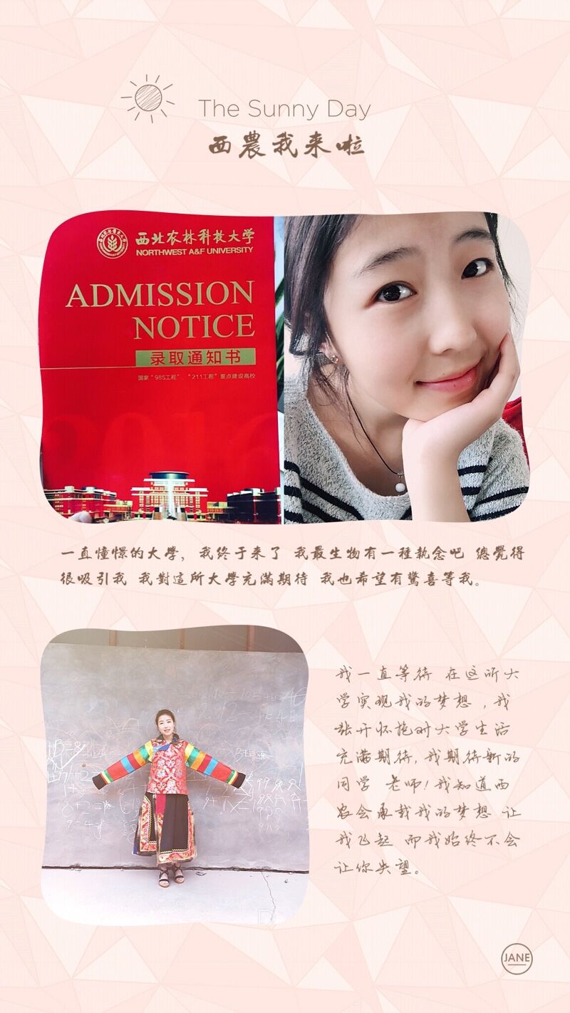 1602班郝敏写到:时光太瘦指缝太宽,转眼真的过去了太久,我已经到了大学的门口。我很庆幸经过高考我选择了西农选择了生命科学。有人说21世纪是生命科学的世纪,我喜欢生物这门学科,没有那么多为什么。喜欢了就会坚持着不悔。新的开始里我希望我能不忘初心,坚持着这份喜欢。
