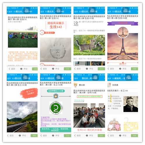公司为促进易班更好的发展,推进“O2O(Online To Offline)”线上-线下联动发展模式,相继策划活动。5月,公司易班工作站组织开展班级文化建设风采展示活动,由14、15级共计21名易班班长落实,联动班级所有班干部配合线下收集素材,在线上对各班班干部组成、班风建设、班级荣誉、文体活动等内容进行了逐一展示,获得良好反响。生科142班曹永新评论到:班级文化风采展示让我们对专业分流后组成的新班级有了更深的认识,新的班干部相互配合组织与宣传,提高了班级的凝聚力!