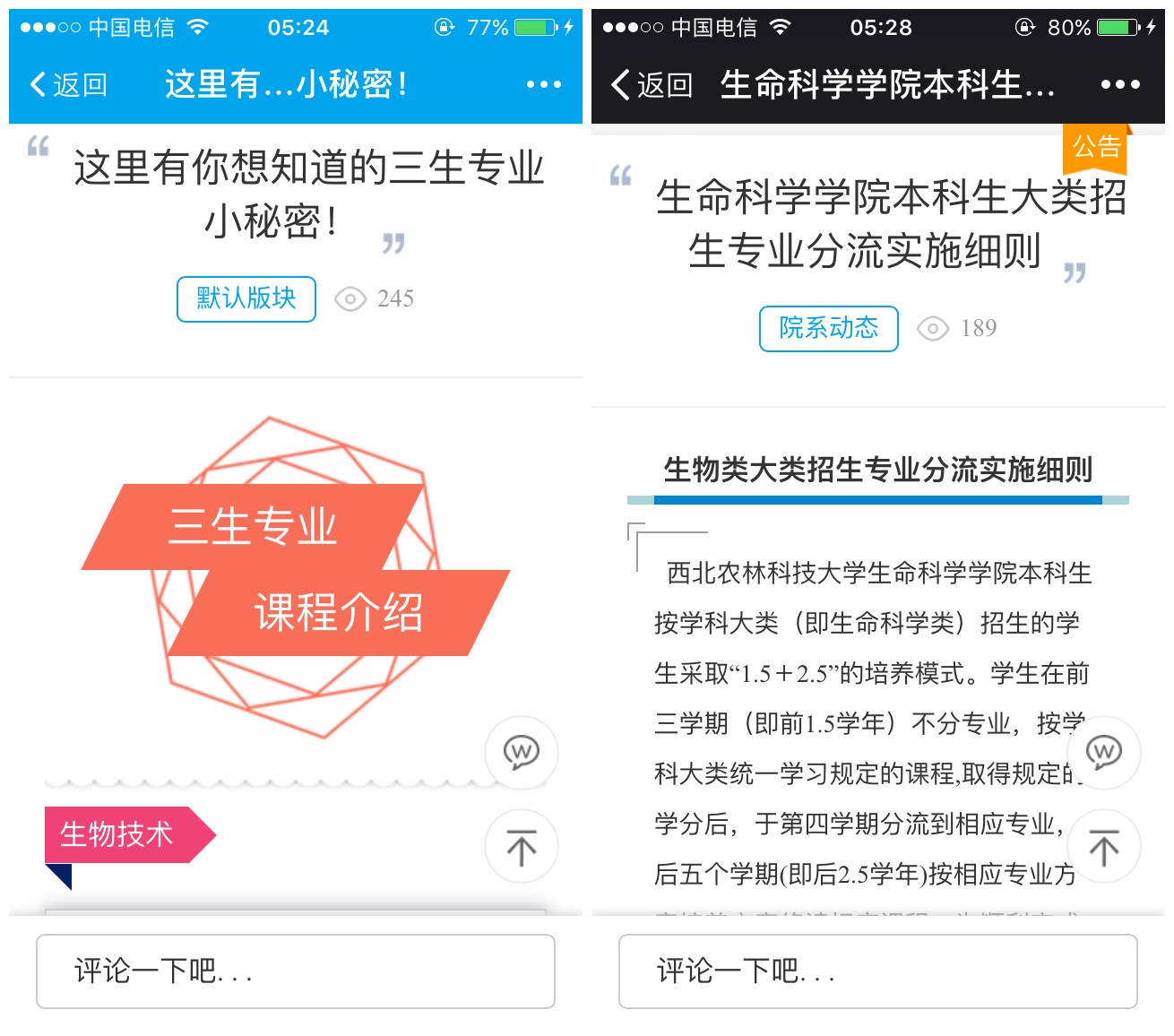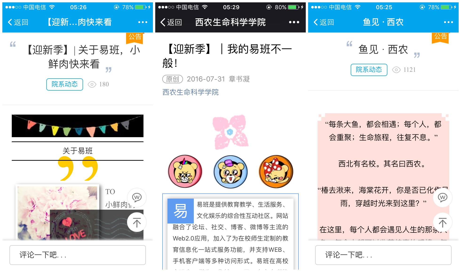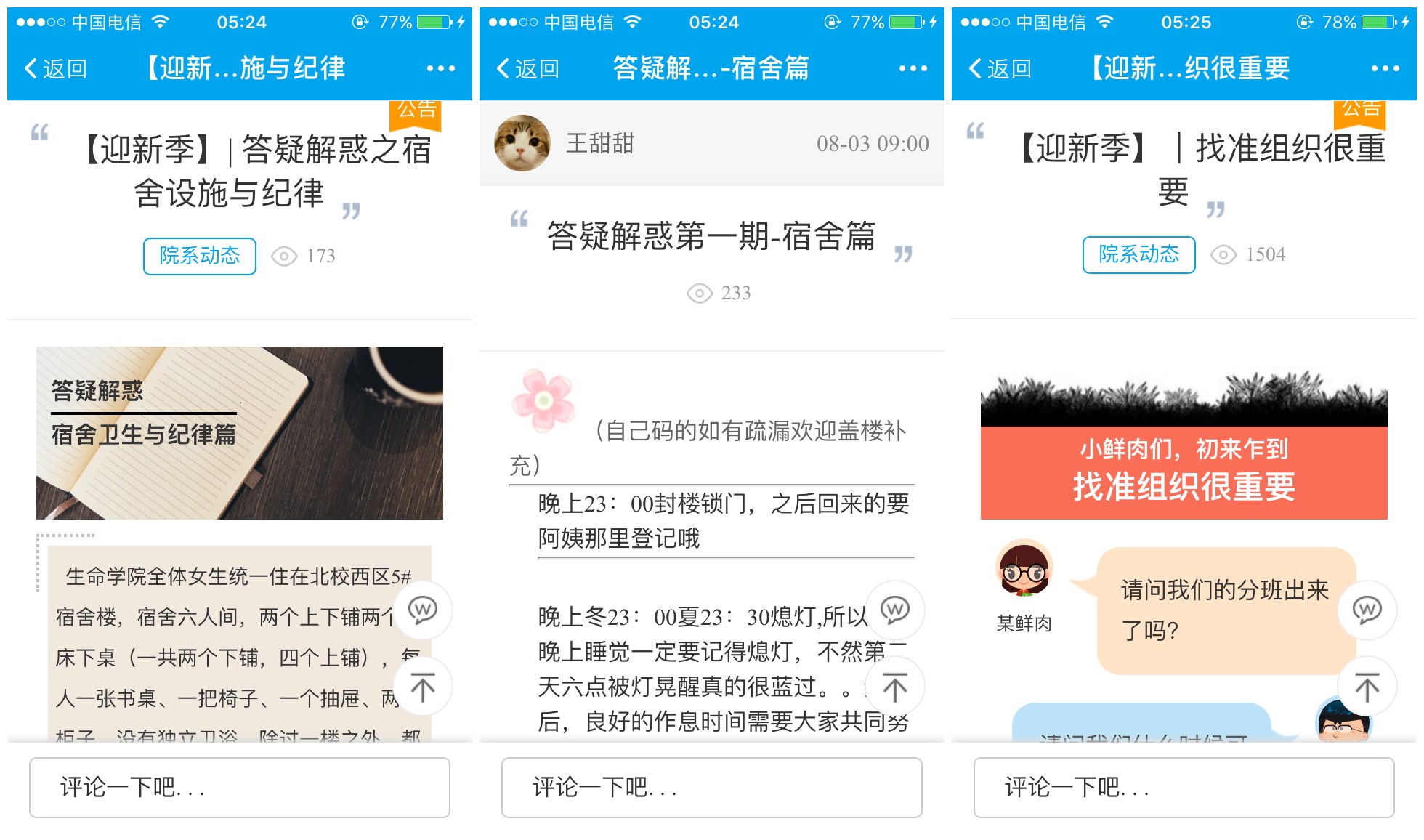 对15级员工而言,第三个学期意味着专业分流的实施,为了能够使他们提前了解,做好充足的准备,公司易班利用暑假时间,推送了关于专业分流实施细则、三生专业课程设置以及三生专业介绍的相关内容,为开学的落实奠定一定基础。1506班的吴丕宇说:“我是易班班长,通过自己找‘三生’专业相关的资料,整理后给班里同学推送,不仅让我更加了解自己的专业,而且还能通过留言评论区跟大家分享自己的见解,很方便!”