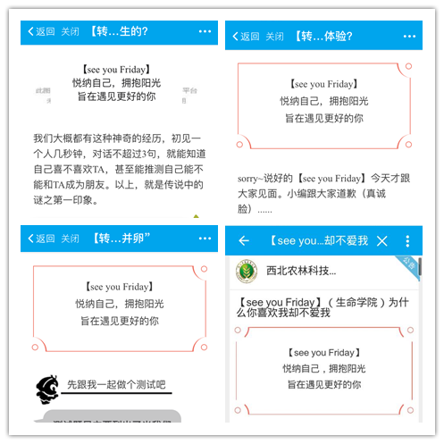 此外,公司还将心理健康教育专栏放在易班上,结合校易班工作站开发的“心理自助”模块,收集员工对心理健康知识的需求与分类,有针对性的设置相应活动,完全由员工自愿选择喜欢和感兴趣的模块报名参加。同时,结合活动反馈,在易班推出“see you friday”专题栏目,不定期推送有关心理健康小测试与知识。
