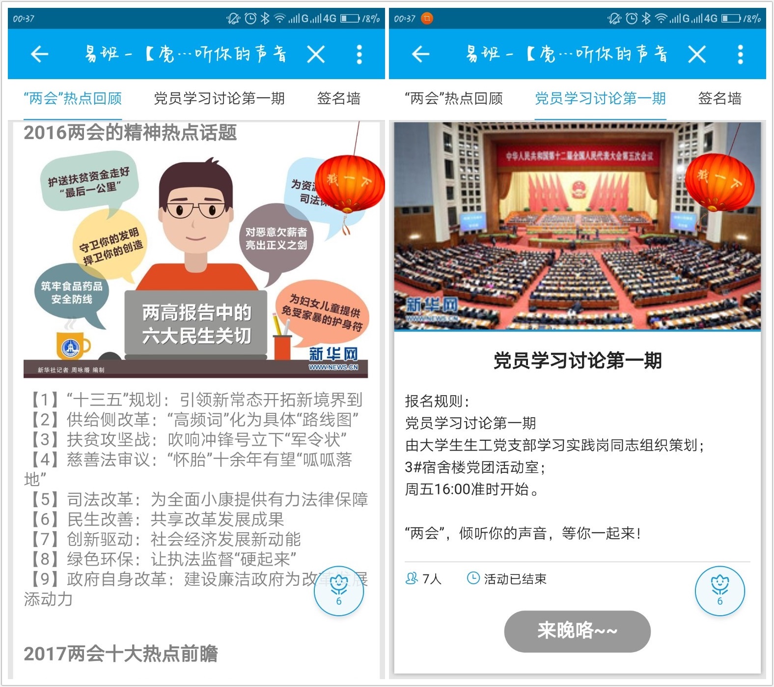 3月伊始,备受关注的“两会”在北京开幕。教育、环境、住房、养老、电商发展等一系列热点问题,让两会成为全民关注程度最高的会议。best365中国官方网站老员工生工党支部在以党小组为单位学习之后,学习实践岗的党员们就这些热点问题采用易班app线上报名,利用员工社区的党团活动室,组织了支部内的第一次专题讨论。到场的9位党员畅所欲言,热议“两会”热点。
