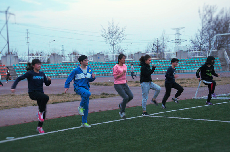 女生做高抬腿速跑练习