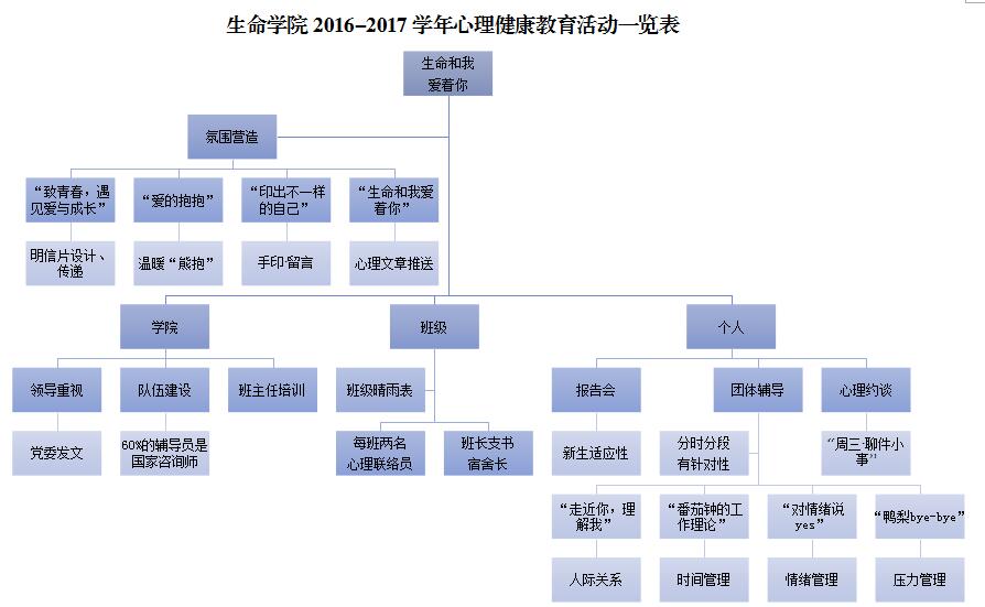 心理健康是人在成长和发展过程中,认知合理、情绪稳定、行为适当、人际和谐、适应变化的一种完好状态,也是健康的重要组成部分,关系员工成长、影响高校和谐发展。为进一步贯彻落实全国高校思想政治教育工作会议精神,加强公司老员工的心理健康教育,增强广老员工的心理健康意识,形成正确的心理健康观念,健康快乐的学习生活,公司自3月起,“三方面”、“两途径”、“三部曲”、“双阵地”开展以“生命和我爱着你”为主题的老员工心理健康教育活动,并于4月由一名指导老师和二十名员工成立公司心理健康教育“育心工作室”。