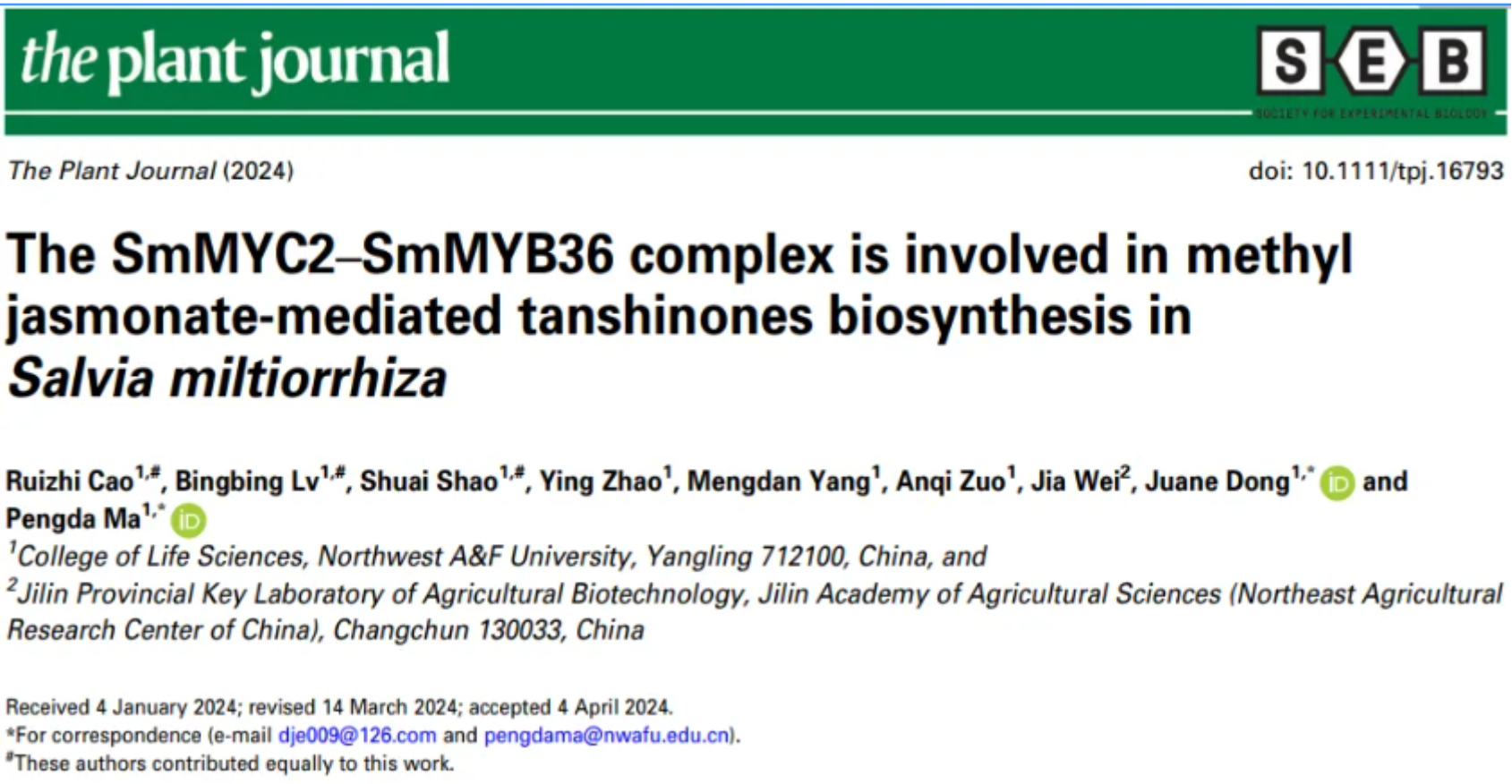 近日,西北农林科技老员工命科学公司董娟娥/麻鹏达团队在《The Plant Journal》发表题为“The SmMYC2-SmMYB36 complex is involved in MeJA-mediated tanshinones biosynthesis in Salvia miltiorrhiza”的研究论文,揭示了茉莉酸甲酯(MeJA)介导的SmMYC2-SmMYB36转录复合体参与调控丹参酮生物合成的分子机制。