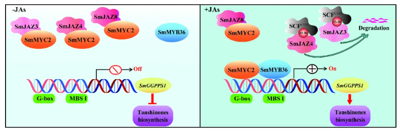 综上所述,该研究阐明了SmJAZ3/4/8-SmMYC2-SmMYB36模块在JA信号介导的丹参酮生物合成中的动态调控机制(图1)。为进一步构建JA信号介导的丹参酮生物合成调控网络奠定了基础,也为丹参酮高效生物制造提供了有用的工具。