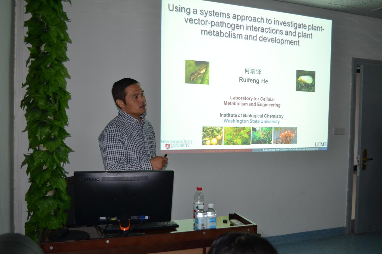 报告会上,Gang 教授围绕“药用植物代谢”的主题,主要介绍了利用扫描质谱揭示药用植物萜类和黄酮类次生代谢物在植物细胞中的分布;并以生姜和姜黄为例,着重讲述了利用分子生物学手段阐明生姜酚、姜黄素等次生代谢物的生物合成途径。何瑞峰教授做了题为“利用一种系统方法研究植物病原菌互作和植物代谢及发育”的报告,主要介绍了植物与动物及微生物互作过程中的研究方法及最新研究进展。两场报告结束后,在场师生与两位教授就报告内容进行了深入探讨与交流,尤其是关于代谢组学的研究方法讨论热烈。