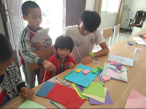 活动前期,志愿者们准备好了做贺卡的卡纸,折爱心用的折纸以及各种手工工具。母亲节当日,实践部成员依照惯例先为孩子们辅导功课,在所有小朋友都完成了作业之后,便开始此次主题支教的内容。志愿者们手把手地教孩子们折爱心,小小的纸片蕴含着他们对母亲的爱。制作贺卡时,孩子们拿着画笔,努力构思,将单调的卡纸做成了色彩缤纷的贺卡。在活动的最后,志愿者们和孩子们一起做游戏,给支教活动留下欢声笑语,为活动画上完美的句号。