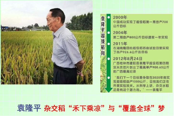 袁隆平,1930年9月生,江西德安人,国家杂交水稻工程技术研究中心、湖南杂交水稻研究中心原主任,湖南省政协原副主席,中国工程院院士,第五届全国人大代表,第六、七、八、九、十、十一、十二届全国政协委员。他不畏艰辛、执着追求、大胆创新,勇攀杂交水稻科学技术高峰,建立和完善了一整套杂交水稻理论和应用技术体系,创建了一门系统的新兴学科——杂交水稻学,实现了我国超级稻第一、二、三、四期大面积种植平均亩产700、800、900、1000公斤的目标。