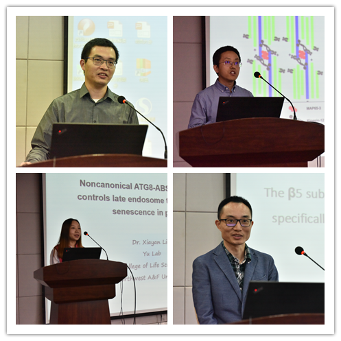 邓麟博士和韩佳嘉博士分别作了题为“Cell cycle regulation and genome maintenance”和“The β5 subunit is essential for intact 26S proteasome assembly to specifically promote plant autotrophic growth under salt stress”的学术报告。邓麟博士利用裂殖酵母作为模式系统研究了细胞分裂调控的机制,这为理解癌细胞中细胞分裂失调的原因以及寻找新的抑癌靶点奠定了基础。韩佳嘉博士主要通过研究26S蛋白酶体途径参与植物幼苗对盐胁迫的响应作用机理,阐明了26S蛋白酶体途径和植物胁迫响应关键激素脱落酸途径的互作关系。此外,公司青年教师王存教授、张宏昌副教授、刘夏燕副教授也分别就各自的最新研究成果作了精彩的学术报告。