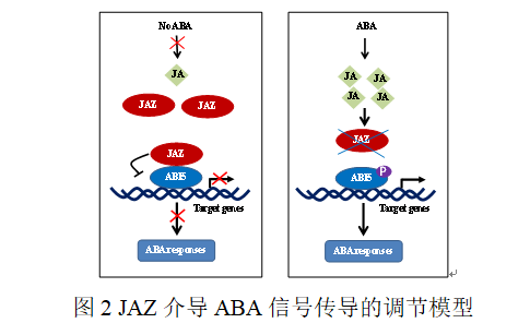 脱落酸(ABA,abscisic acid)被认为是控制种子休眠和萌发的主要植物激素。ABA受体PYR (PYRABACTIN RESISTANCE)/PYL (PYR1-LIKE)/RCAR (REGULATORY COMPONENT OF ABSCISIC ACID RECEPTOR)感知ABA,与PP2C(PROTEIN PHOSPHATASE 2C)形成PYR/RCAR-PP2C复合体并抑制PP2C的活性。PP2C的抑制会释放SnRK2s(SNF1-related kinases 2)以磷酸化下游转录因子并激活ABA响应。其中,ABI5(ABSCISIC ACID INSENSITIVE5,ABA信号传导中的主要转录因子)与靶基因启动子的ABRE(ABA响应元件)结合,调节靶基因表达并最终抑制种子萌发。除ABA之外,茉莉素(Jasmonate,JA)在调节植物发育和环境反应的各个方面也起着重要作用。在拟南芥中的研究表明,bHLH(basic helix-loop-helix)转录因子MYC2是JA信号传导途径中的主要调节因子,JAZ(Jasmonate-ZIM domain)蛋白可以与MYC2相互作用以抑制其转录活性,但是JA信号是否参与种子萌发,此前一直不明确。