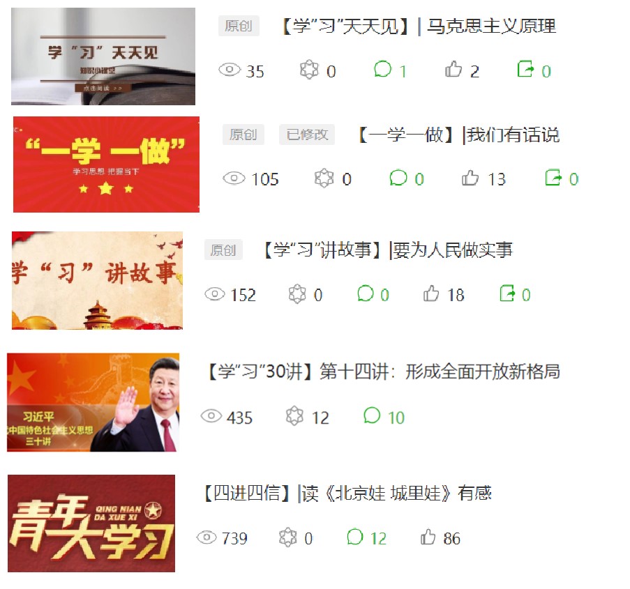 举办微讲坛,强化员工思想建设。结合“国家公祭日”、“纪念马克思诞辰200周年”、“庆祝改革开放40周年”、“纪念五四运动100周年”等重大事件,公司团委精心策划理论宣讲、学习讨论、主题演讲、传唱红歌、经典诵读等教育活动,大力弘扬社会主义核心价值观,提高广大团员青年思想政治觉悟,提升道德修养。充分借助融媒体平台,多网联动,打造线上研讨,线下实践的教育模式。通过微信推送“学习天天见”、“学习讲故事”、“学习用典故”、“学习三十讲”、“一学一做”等专题栏目、空间动态发布、QQ网络直播、易班发帖、抖音记录、微博推广、网站新闻报道等多种途径让思想教育无处不在。使广大团学青年自觉把爱国情、强国志、报国行融入实现中华民族伟大复兴的行动中,全心引领德育建设。