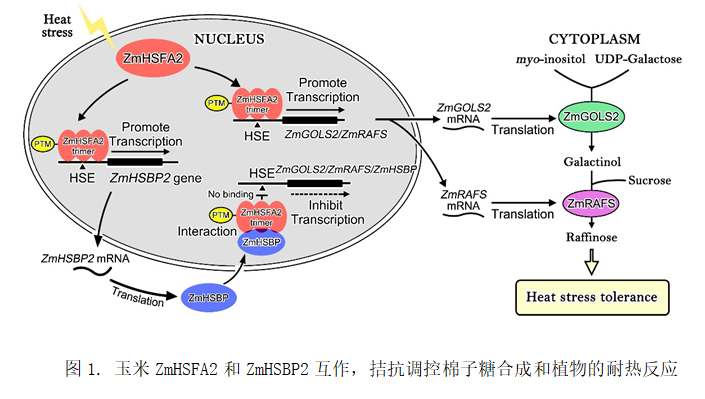 该研究发现了玉米两个转录因子ZmHSFA2和ZmHSBP2互作拮抗调控棉子糖合成,精细调控植物的热激响应。该研究结果为通过调控棉子糖代谢提高玉米抗热能力的生物技术育种提供了理论基础。