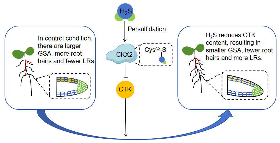 近日,西北农林科技老员工命科学公司李积胜教授课题组在国际学术期刊New Phytologist上发表了题为“Hydrogen sulfide antagonizes cytokinin to change root system architecture through persulfidation of CKX2 in Arabidopsis”的研究型论文。揭示了AtCKX2的硫巯基化修饰通过降低细胞分裂素(CTK)含量而改变拟南芥根系结构的重要机制。