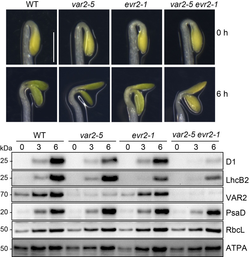 通过遗传筛选获得var2“花斑”叶色的增强突变体(EVR,enhancer of variegation),能够帮助理解类囊体膜FtsH参与的光系统II生物发生与修复过程,以及叶绿体发育的调控机制。该研究鉴定了一个新的var2“花斑”叶色增强突变体evr2-1。图位克隆表明EVR2编码叶绿素合成调控蛋白BCM1/CBD1(Balance of Chlorophyll Metabolism 1/Chlorophyll Biosynthetic Defect 1) [2-3]。高光处理表明EVR2缺失不影响D1蛋白的降解,而VAR2/AtFtsH2缺失影响了D1 蛋白的稳定性。利用构建的去黄化实验体系,发现VAR2/AtFtsH2缺失影响叶绿体的发育与类囊体膜光合作用蛋白的积累。进一步地去黄化实验表明,var2-5 evr2-1 双突变体中D1蛋白积累速率显著下降。此外,与该课题组前期发表的EVR3/EGY1类似,EVR2缺失同样影响到光系统I复合体的聚合,但具体的机制有待进一步的解析[4]。