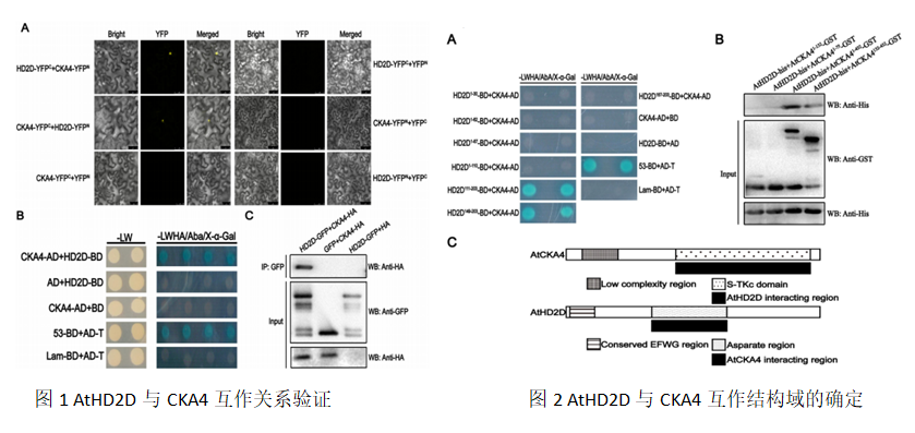 本论文在前期研究的基础上,获得了干旱胁迫下WT、过表达HD2D基因植株和T插入hd2d突变体植株的转录组测序结果,分析后首次发现HD2D参与ABA依赖的干旱胁迫过程,过表达HD2D基因会增加植株的抗旱性和ABA敏感性,利用GST-Pull down与质谱分析初步筛选干旱胁迫下HD2D的互作蛋白。通过酵母双杂交实验(Yeast two-hybrid)、双分子荧光互补实验(BiFC)以及免疫共沉淀实验(Co-IP)确定与HD2D存在相互作用的蛋白质CKA4,同时HD2D参与植物应对逆境的ABA途径以及根系发育过程。本研究首次鉴定到HD2D与CKA4蛋白相互作用,并且发现磷酸化共价修饰调节对HD2D发挥功能的必要性,为后续研究HD2D与CKA4参与调控生物学过程提供新思路;同时为研究新型抗旱品种和更新种质资源提供新的基因资源。