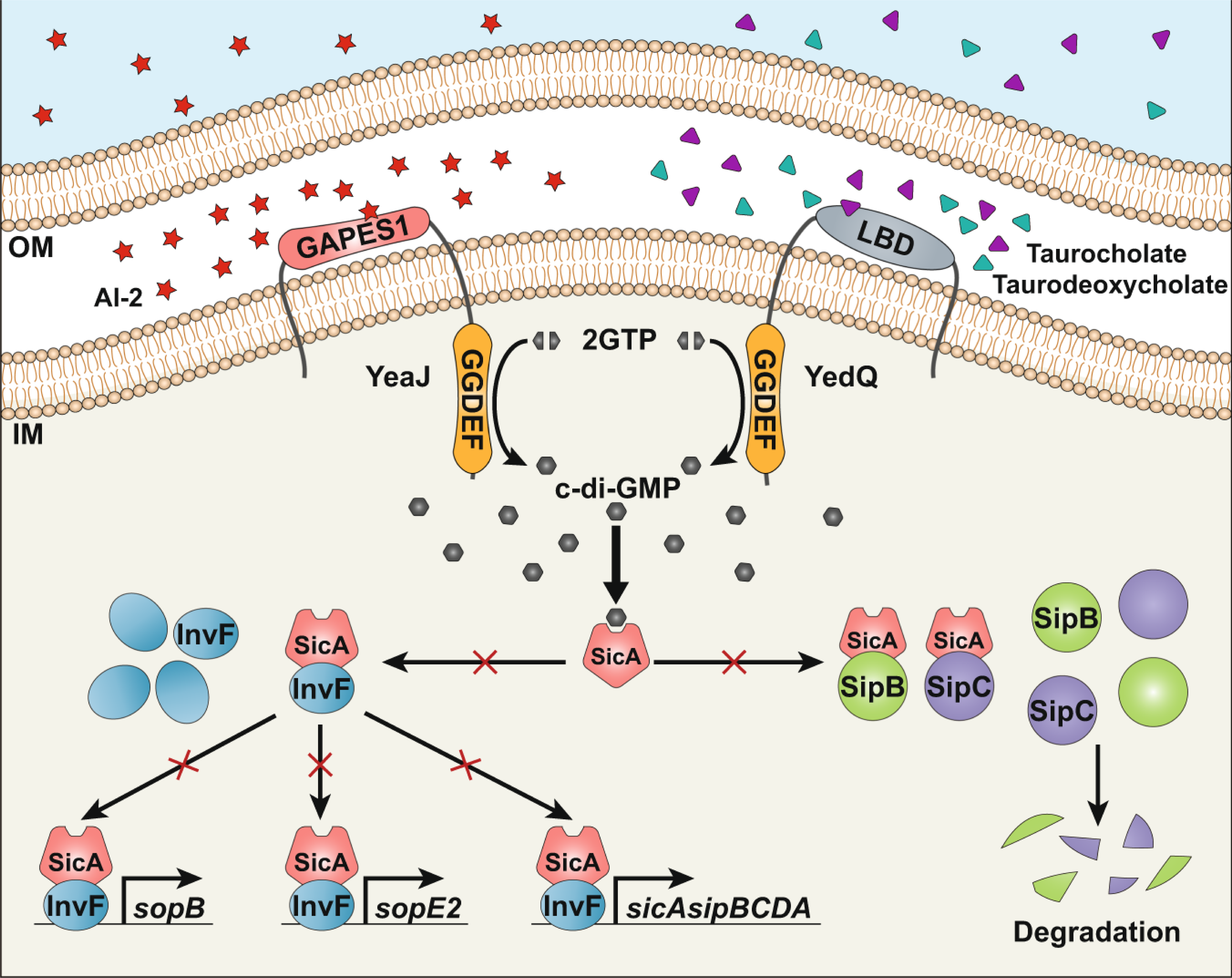 图2. AI-2与胆汁酸盐通过c-di-GMP信号途径调控T3SS活性的分子机制