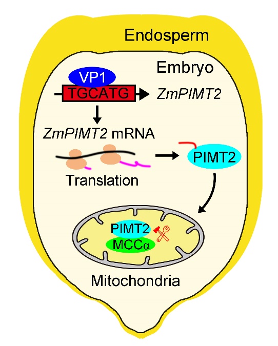 研究人员发现玉米ZmPIMT2基因突变后种子活力降低,过表达ZmPIMT2可显著提高玉米种子活力;发现ZmPIMT2定位于线粒体和叶绿体并鉴定到与ZmPIMT2在线粒体中互作的3-methylcrotonyl COA carboxylase subunit α (ZmMCCα)。ZmMCCα与线粒体能量代谢密切相关。进一步研究发现ZmMCCα蛋白质中至少存在4个天冬酰胺位点易发生损伤,过表达ZmPIMT2玉米种子在老化处理后ZmMCCα蛋白受损伤的程度降低。此外,此项工作发现了ZmPIMT2在种子发育成熟过程中受转录因子ZmVP1调控。