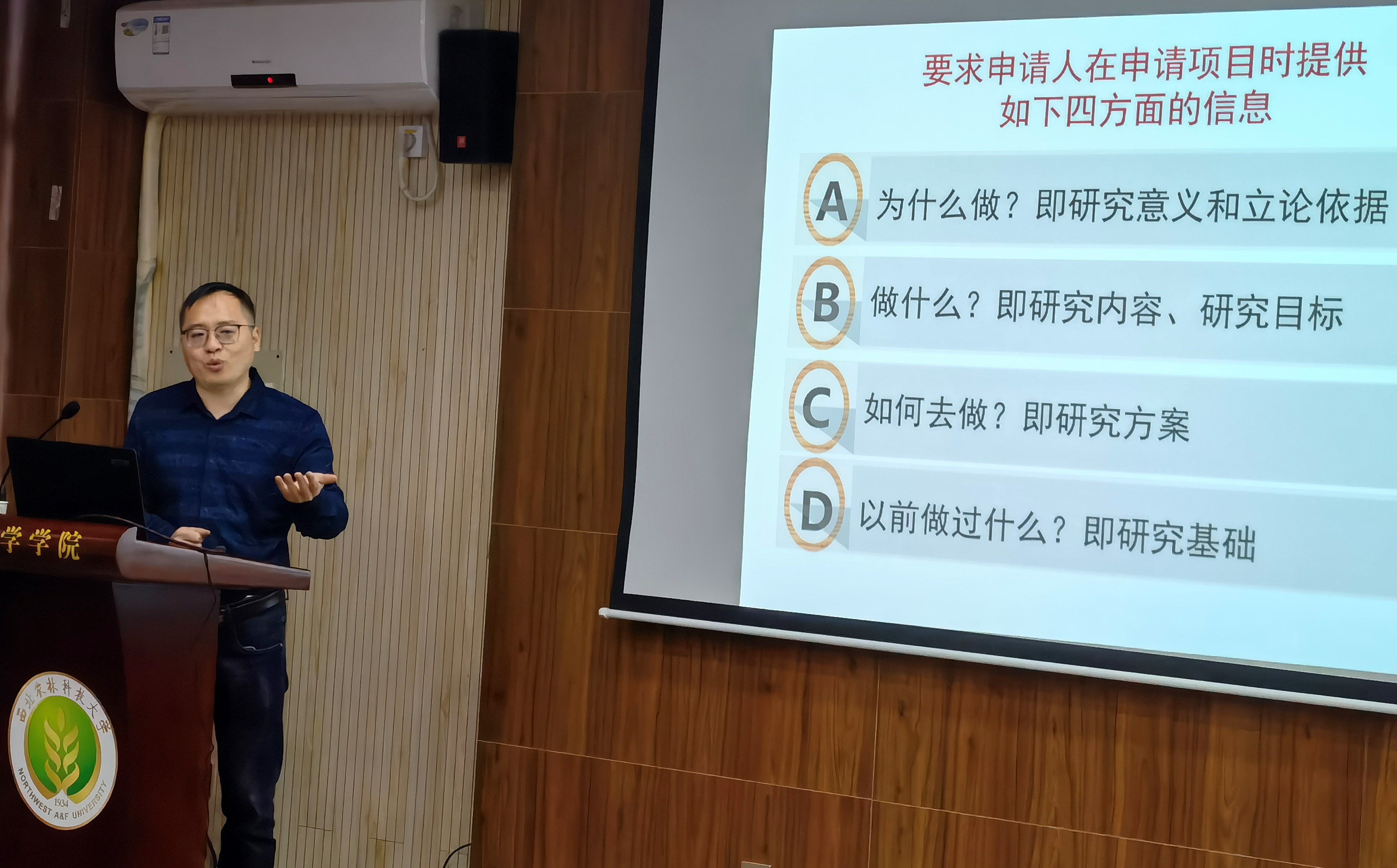 花保祯教授分别从选题、摘要、立项依据、研究内容、研究方案和可行性分析、项目的特色与创新之处、工作基础、工作条件等方面,分享了自己的基金申请体会和经验,对基金项目申请书的关键环节及写作要领等内容进行了详细讲解。